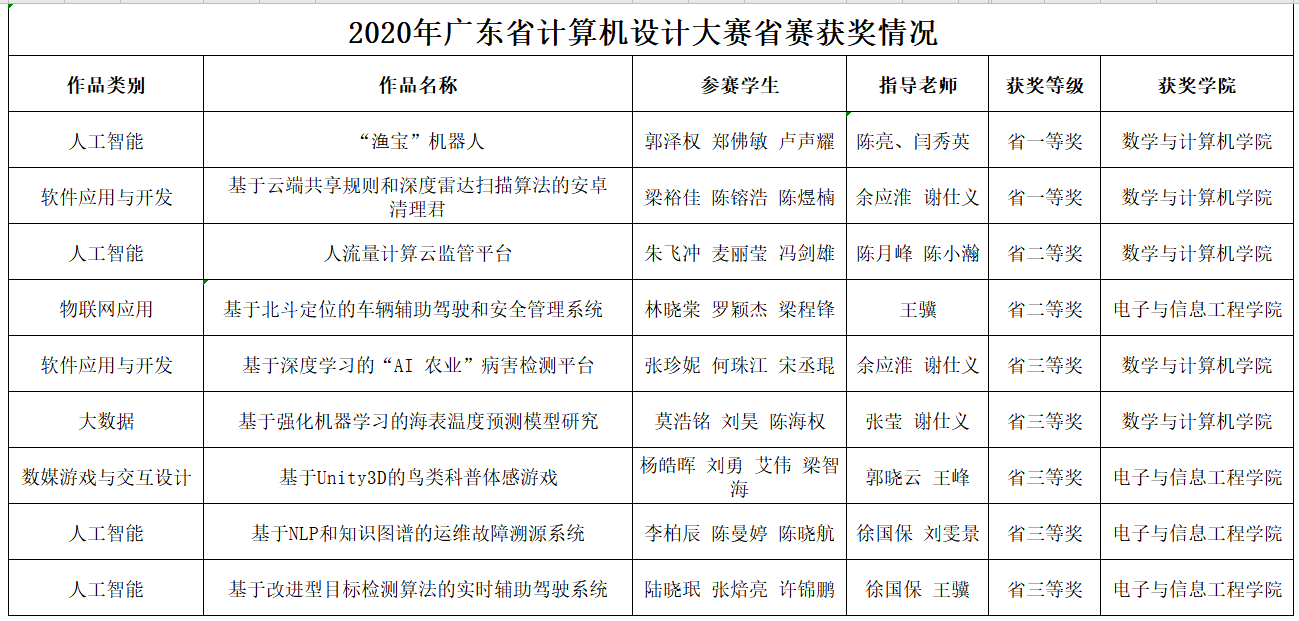 6月24日,由广东省教育厅主办的“2020年广东省大学生计算机设计大赛”落下帷幕。今年的比赛有来自广东省80多所本科院校共1129件作品参加。经过初评和复审两个环节,共评选出582件作品晋级省决赛。我校学子在比赛中不畏强手,奋力拼搏,最终获得广东省一等奖2项、二等奖2项、三等奖5项的好成绩。其中来自williamhill中文团队的《“渔宝”机器人》和《基于云端共享规则和深度雷达扫描算法的安卓清理君》两项作品勇夺省赛一等奖。