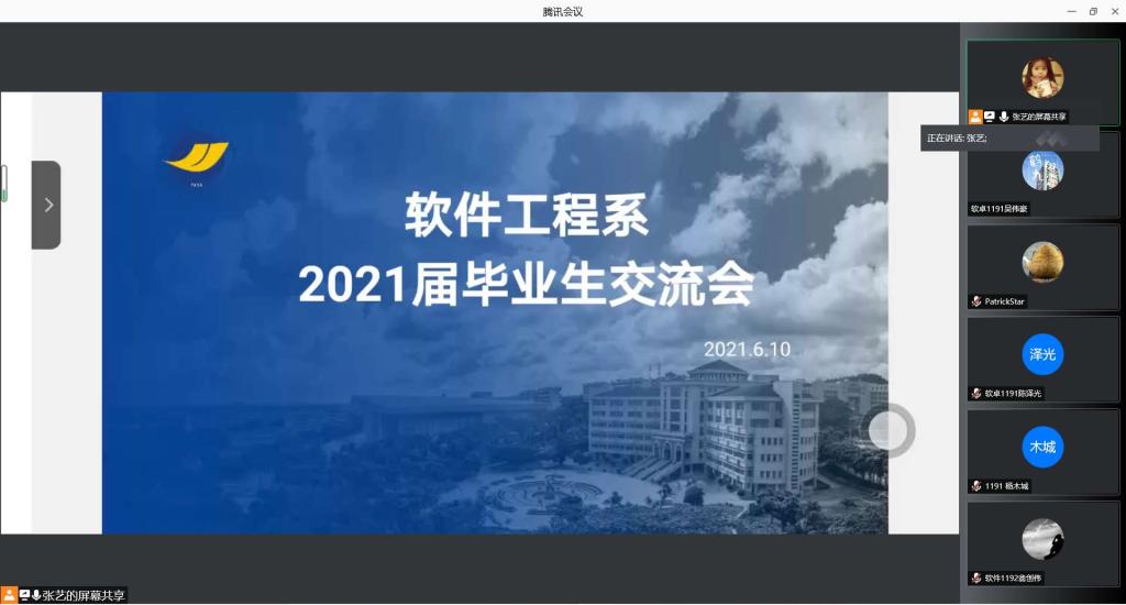 为推动党史学习教育主题活动走深走心走实,贯彻落实“我为群众办实事”,6月10日晚,软件工程系学生党支部邀请了5名2021届优秀毕业生代表,在腾讯会议室举行“学四史,办实事,树榜样,做表率”优秀毕业生交流会,辅导员张艺、赵鸿洲及软件系130余名学生参会。
