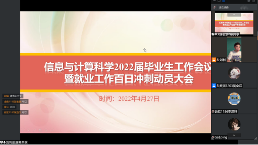 疫情常态下毕业生就业形势十分严峻。为促进毕业生更充分更高质量就业,4月27日晚,信息与计算科学系召开2022届毕业生工作会议暨就业工作百日冲刺动员大会。会议由分管就业工作辅导员刘利主持,系主任李升、副主任王红青、数据科学与大数据系副主任韩筠、2022届毕业生班主任赵瑜、吴伟娜、张雨濛和2022届全体毕业生参加。