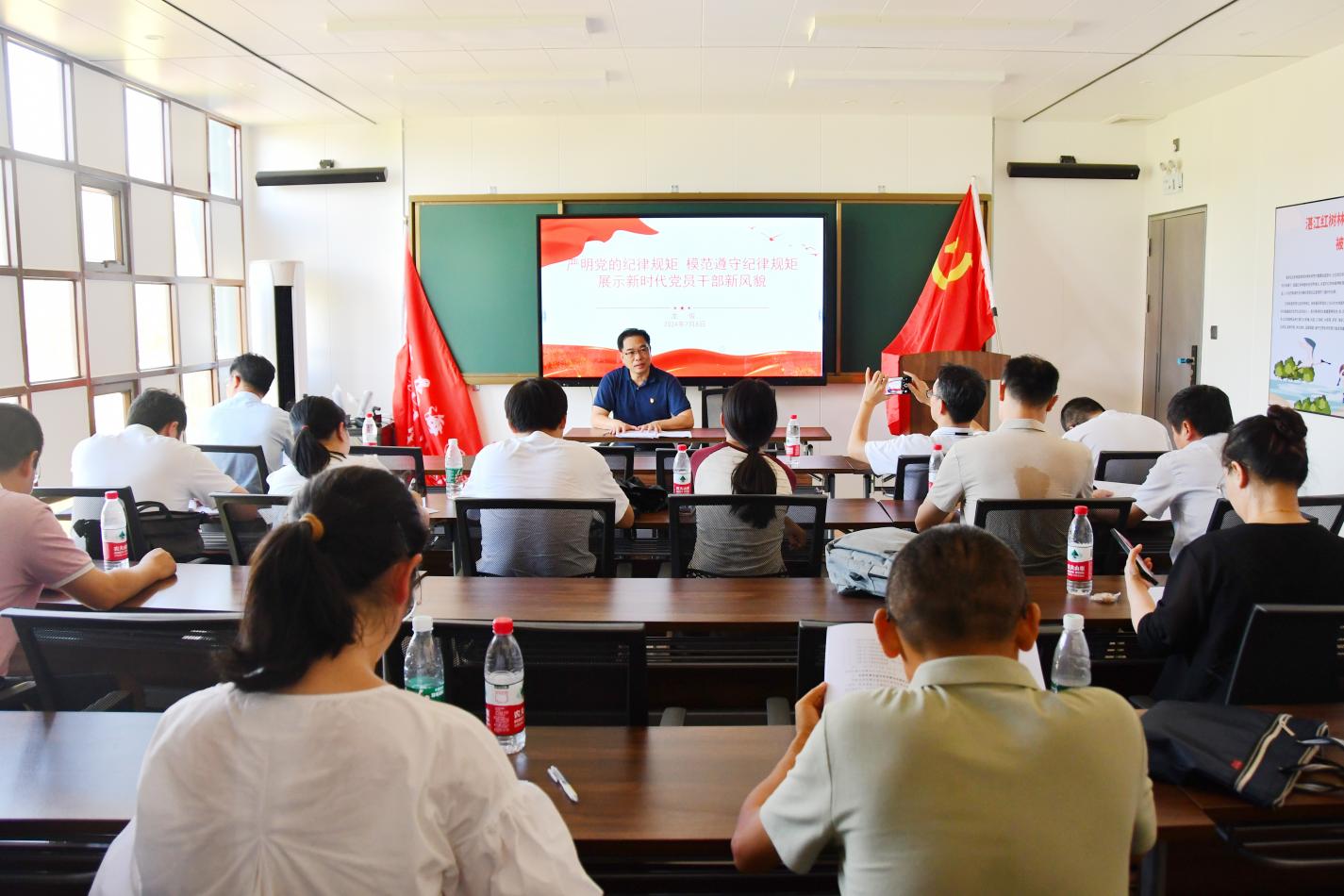 在金牛岛红树林党群活动会议室,学院党委书记龙俊以“严明党的纪律规矩模范遵守纪律规矩展示新时代党员干部新风貌”为主题开展党委理论学习中心组学习。