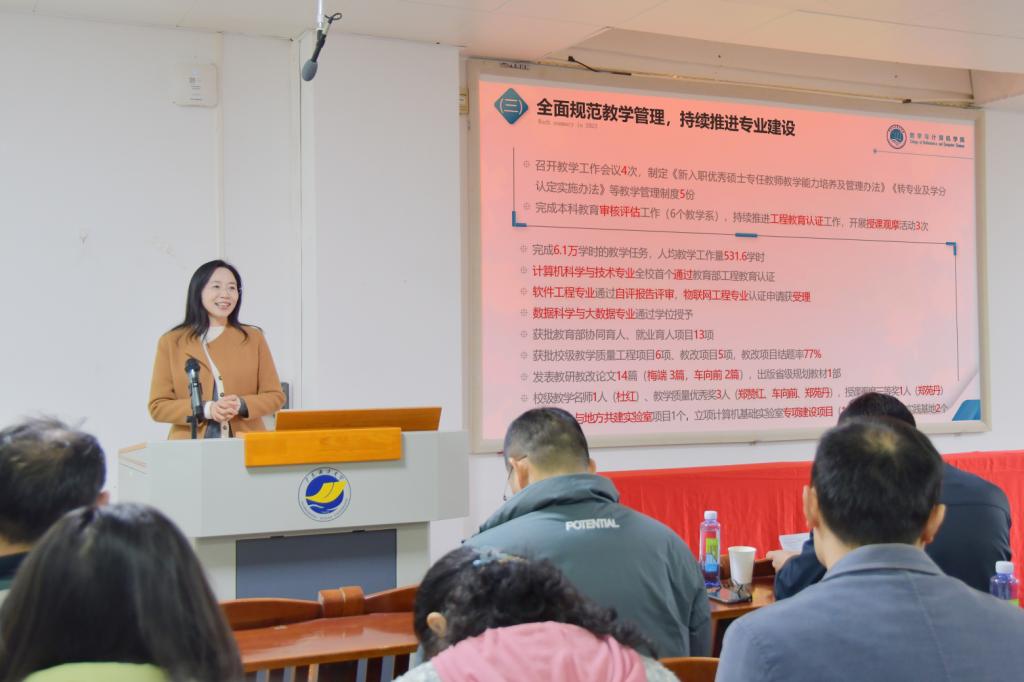 院长彭小红教授首先对2023年学院工作进行了总结,充分肯定了学院在完善规章制度、优化师资队伍、规范教学管理、加强学科建设、坚持以德树人推动威廉希尔以及在学科竞赛、工会活动等各方面所取得的优异成绩。然后彭小红对新学期学院的党建和思政、学风和师德建设、教学和专业建设、学科和研究生教育、科研和社会服务、推进“三全育人”体系建设等各方面工作进行了部署。